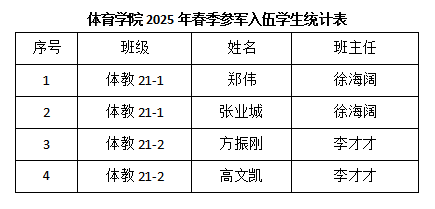 近5年来,公司80余名学子圆梦军营,在部队“大学堂”磨炼意志、淬炼品格,充分展现了新时代延大体育学子的良好精神风貌,以实际行动为母校争光,为科技强军及军队现代化建设贡献青春力量。2025年春季入伍员工4人,均为2025届毕业生。