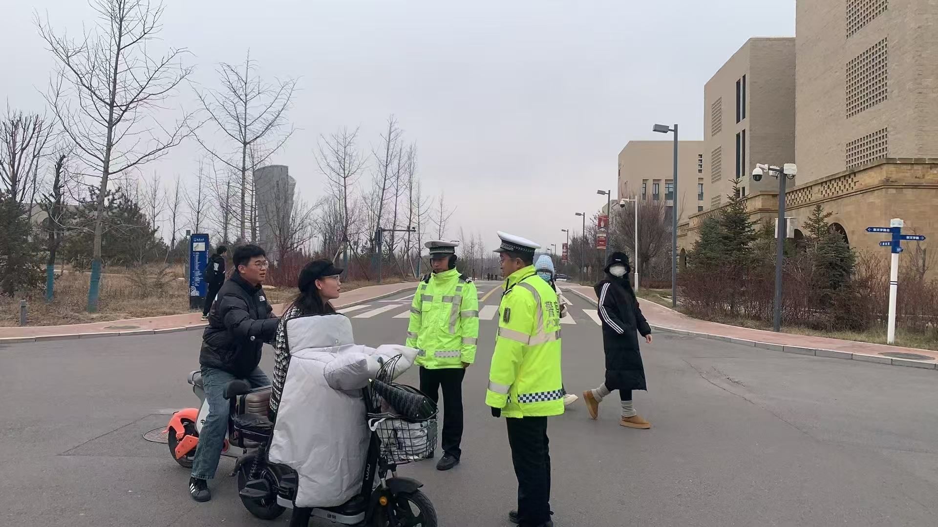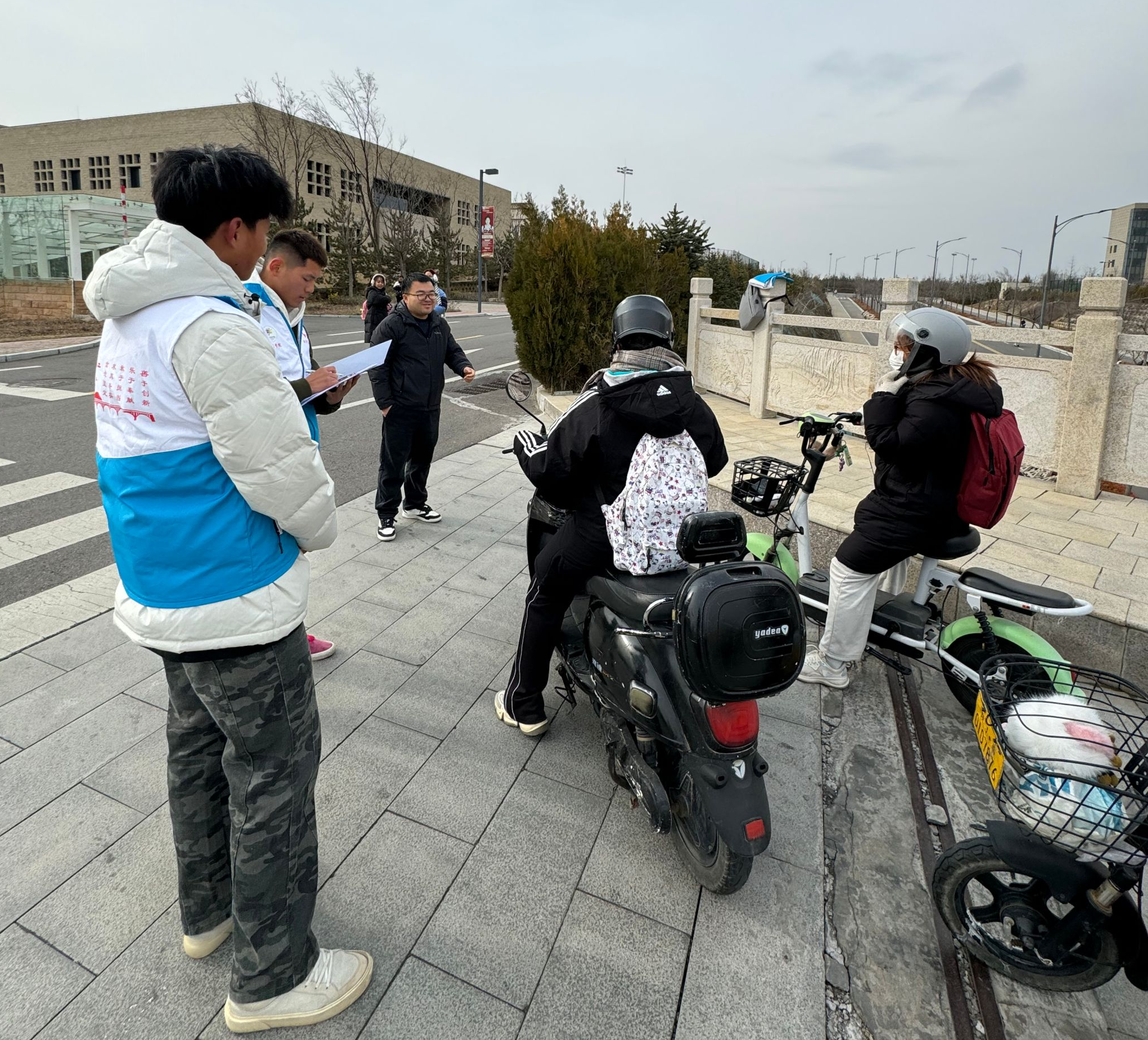 天气虽然寒冷,但全体员工干部依然顶着凌冽的寒风,身穿志愿者马甲,配合党委保卫部工作人员在行政楼天桥、南区教学楼、田径场周边区域值守,在师生就餐、上下课、上下班等车流高峰期对过往的电动车骑行者进行逐一提醒、劝阻、督促。对持有头盔而未佩戴的人员,现场开展安全教育,要求其佩戴头盔;对未购买头盔或未携带头盔人员,首次发现登记个人相关信息,并提醒配齐安全头盔后再上路骑行。全体工作人员还对校园内乱停乱放的自行车和电动车进行了规范整理。