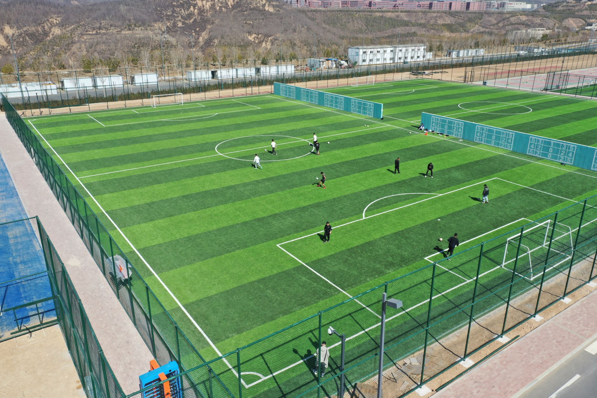 新校区室外体育场地包含标准田径场1块、标准十一人足球场2块、七人制足球场2块、五人制足球场2块、标准篮球场12块、标准排球场6块、标准网球场4块、标枪场地1块、铅球场地2块,建筑面积43765.96㎡。