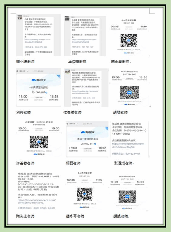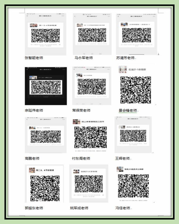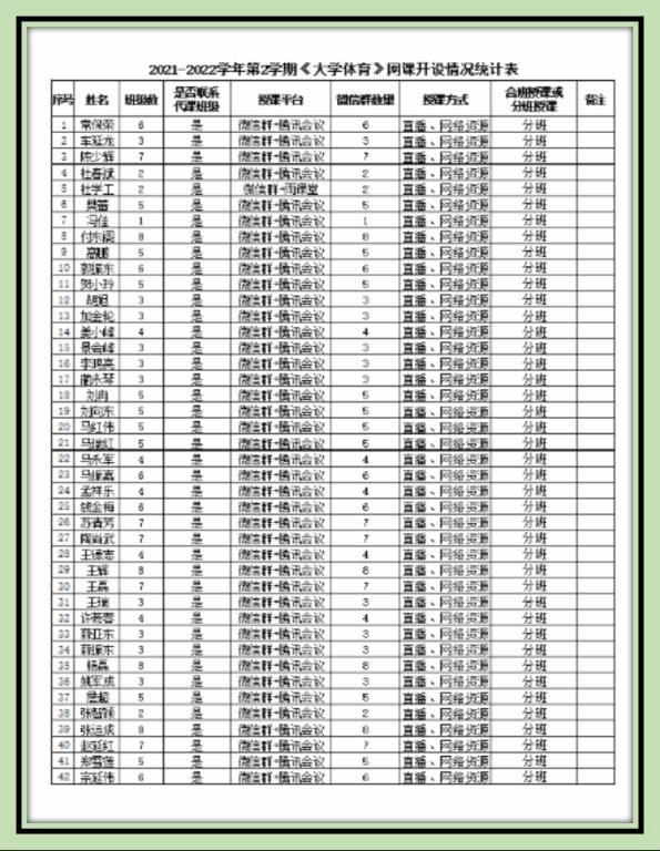 教师根据2021-2022学年第2学期《大学体育》课程表,在各自班级群内授课,完成课堂考勤、讲解示范、互动答疑等环节。内容可以是健身类APP,教学PPT,体能训练或运动项目的相关图片、动图或视频,竞赛规则、竞赛视频等。
