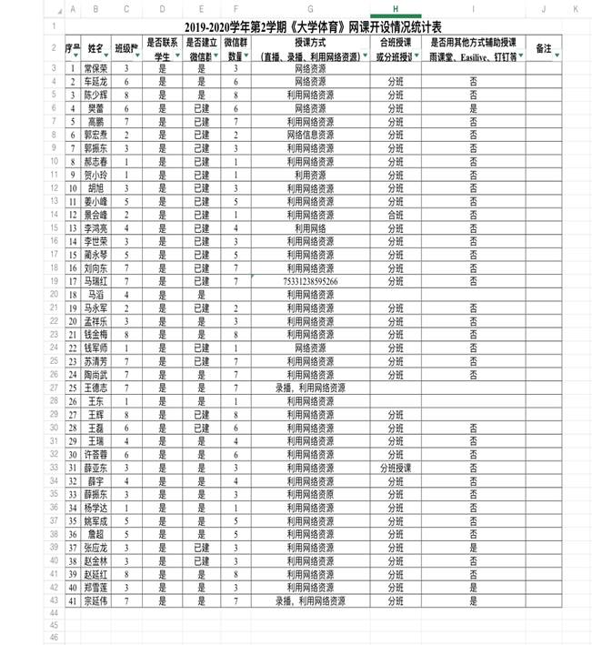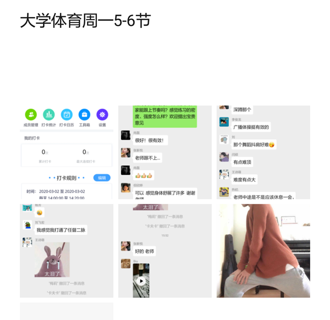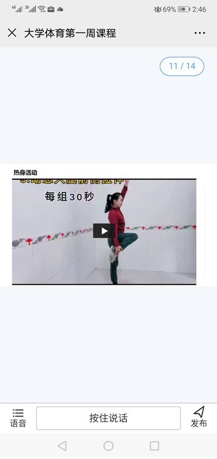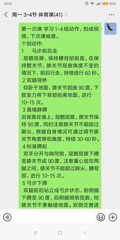 3月2日,伟德官网bv网课开学第一天,15个班级的《大学体育》网课,如期开课。为加强新冠肺炎疫情防控工作,根据教育部、省教育厅有关工作要求,公司决定在新冠肺炎疫情防控期间开展本科课程线上教学,大学体育教学部积极响应公司“停课不停教,停课不停学”教学目标,经前期多次论证,起草并制定《伟德官网bv新冠肺炎疫情防控期间大学体育实施方案》,从六个方面对在新冠肺炎疫情期间的《大学体育》课进行详细安排,利用雨课堂;智慧树;腾讯会议;钉钉直播;微信等平台,围绕“全程关爱,全面育人”的目标,整合现有资源,体现体育教学特色,引导员工积极参加体育锻炼,缓解心理压力,提高身体素质,增强身体抵抗力和机体免疫力。根据《大学体育》教学大纲要求,结合体育课特点,考虑居家锻炼的环境和条件,推送以身体素质的体能训练为主,各个运动项目为辅的教学内容,采用课堂教学和日常锻炼指导等多种方式进行。教师面对疫情,教学热情高涨,员工响应积极,课堂效果良好,目前课程正有序开展中。