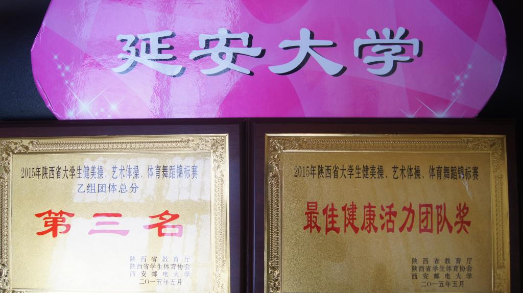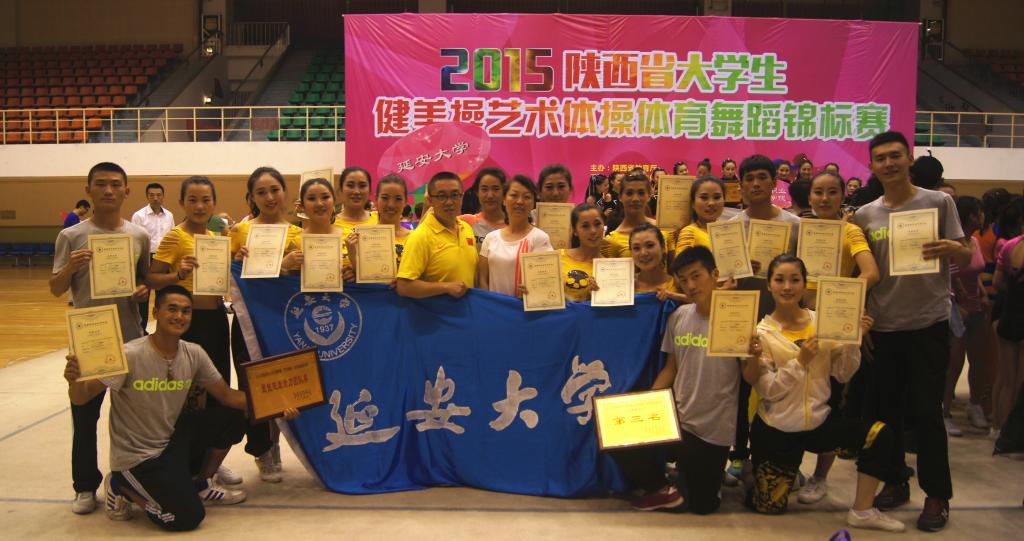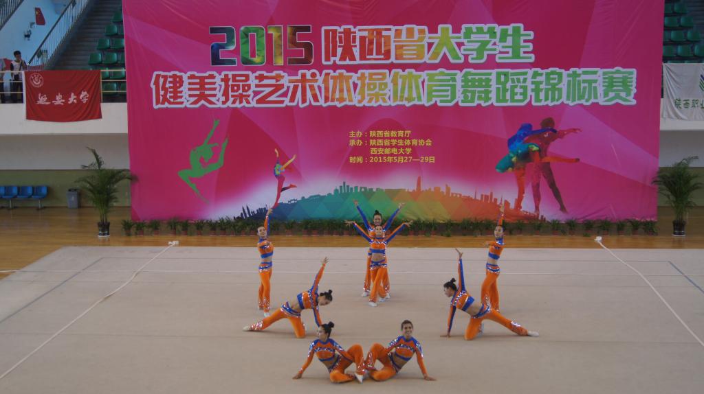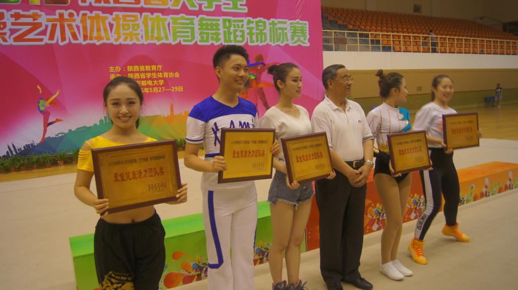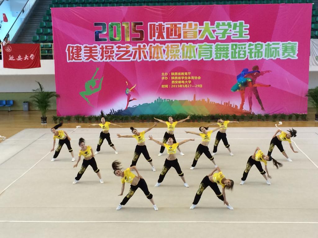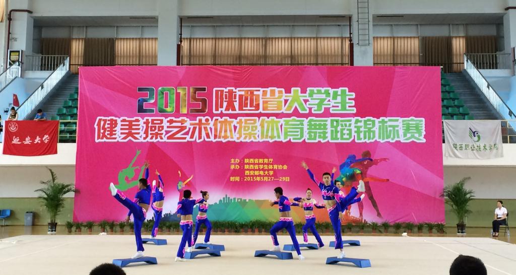 由陕西省教育厅主办的、陕西省员工体育协会、西安邮电大学承办的2015年陕西省老员工健美操锦标赛,于5月27至31日在西安邮电大学长安校区体育馆举行。由6名老队员和12名新队员组成的健美操队,在领队郑兵、教练宗延伟、张智颖的带领下,经过赛前一个多月的精心编排与刻苦集训,并希望通过本次比赛为年底的全国比赛积累参赛经验。在与教育部批准的设有高水平运动队和体育特长生单独招生的高校同组参加的C组比赛中,参加的4个项目中有3个项目进入前三名,其中街舞Jazz规定套路获得第一名;中国风健身舞-神秘雪山获得第二名;有氧舞蹈自编套路获得第三名,最终获团体总分第三名,并获“最佳健康活力团队奖”。宗延伟老师被评为“优秀教练员”冯梦娇、岳晓旭同学被评为“优秀运动员”。
