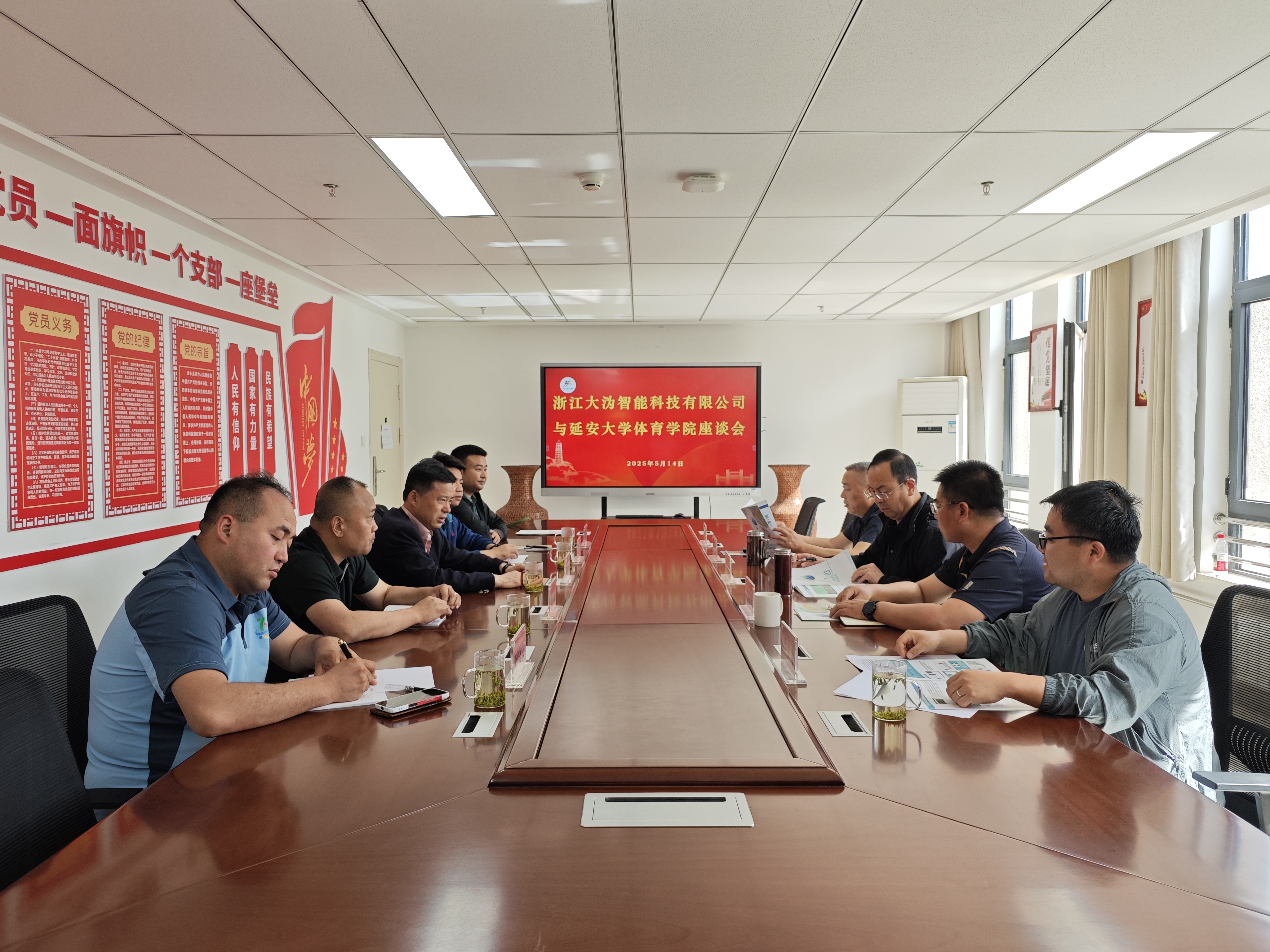 宗有智对大沩科技董事长朱庆丰一行的到来表示热烈欢迎,并介绍了公司的发展概况、人才培养、科学研究等情况。兰鸿涛重点介绍了公司办学特色、服务地方经济发展情况,表达在体育人才联合培养、共同研究方向、老员工就业创业等方面校企合作的愿景。