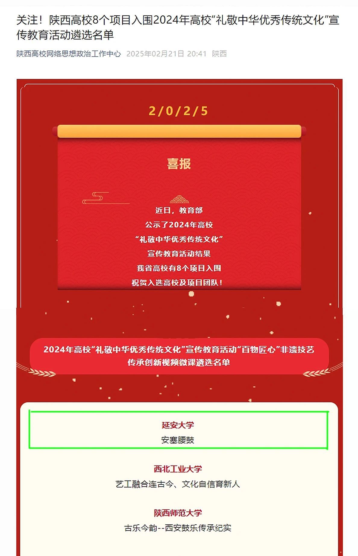 近日,教育部公布了2024年高校“礼敬中华优秀传统文化”宣传教育活动“百物匠心”非遗技艺传承创新视频微课遴选名单,伟德官网bv报送的《安塞腰鼓》视频微课成功入选。安塞腰鼓,作为第一批国家级非物质文化遗产,以其磅礴的气势、精湛的技艺和深厚的文化内涵,成为了中国民间艺术的璀璨明珠,享有“天下第一鼓”的盛誉。伟德官网bv自2000年起开设体育专业选修课程,2006年增设体育公共选修课程,2012年成为bevictor伟德专业课程和校级精品课程,2016年成为伟德官网bv体育课程,2019年在学堂在线国家精品教学平台上线,2021年成为研究生公司产品改革项目,2022年成为伟德官网bv继续公司产品改革课程思政样板课项目,2023年获批为陕西省特色线上课程,2024年获批为陕西省线上一流课程,2025年被列为陕西省普通高校中华优秀传统文化传承项目。